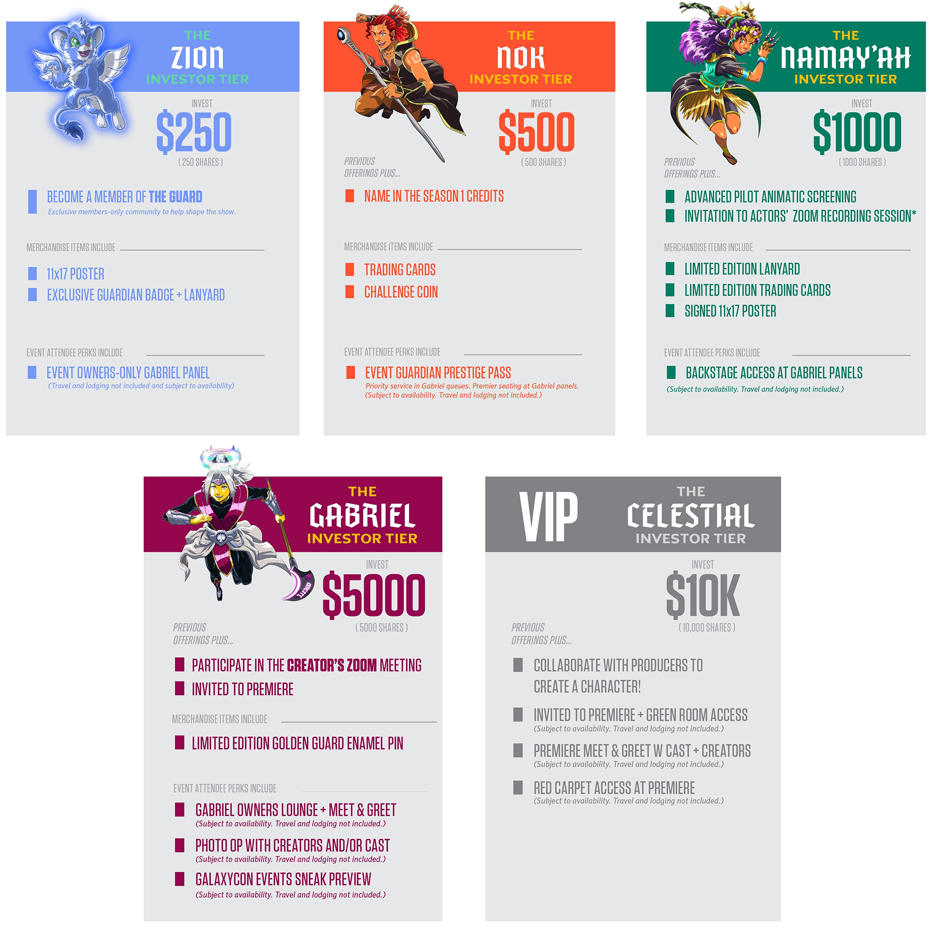 Previous Perks plus: Advanced Pilot Animatic Screening, Actors' Zoom Recording Session, Limited Edition (LE) Lanyard, LE Trading Cards, Signed 11x17 Poster, and Backstage access at Gabriel Panel. (Subject to availability. Travel and Room and Board not included)